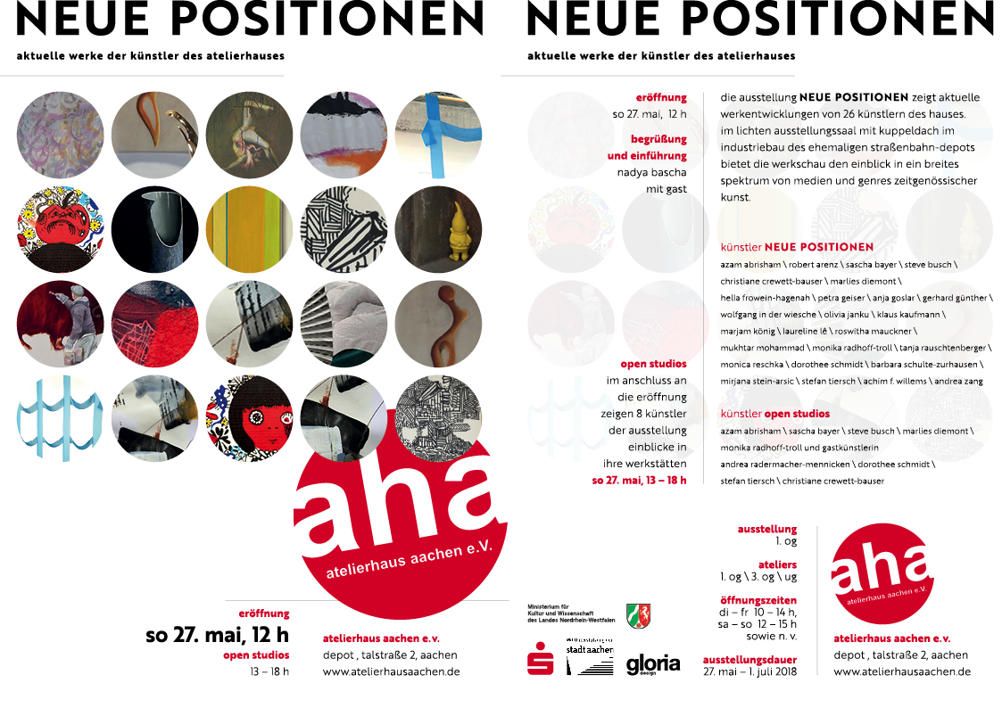 Mit 32 Künstlern und 22 Artstudios an einem Standort, ist das Atelierhaus ein bedeutendes Zentrum zeitgenössischer Kunst in der EUREGIO Maas-Rhein. Die Ausstellung Neue Positionen zeigt aktuelle Werkentwicklungen der Künstler des Hauses. Im lichten Ausstellungssaal des Industriebaus eines ehemaligen Straßenbahn-Depots, bietet die Werkschau Einblick in ein breites Spektrum zeitgenössischer Tendenzen.
